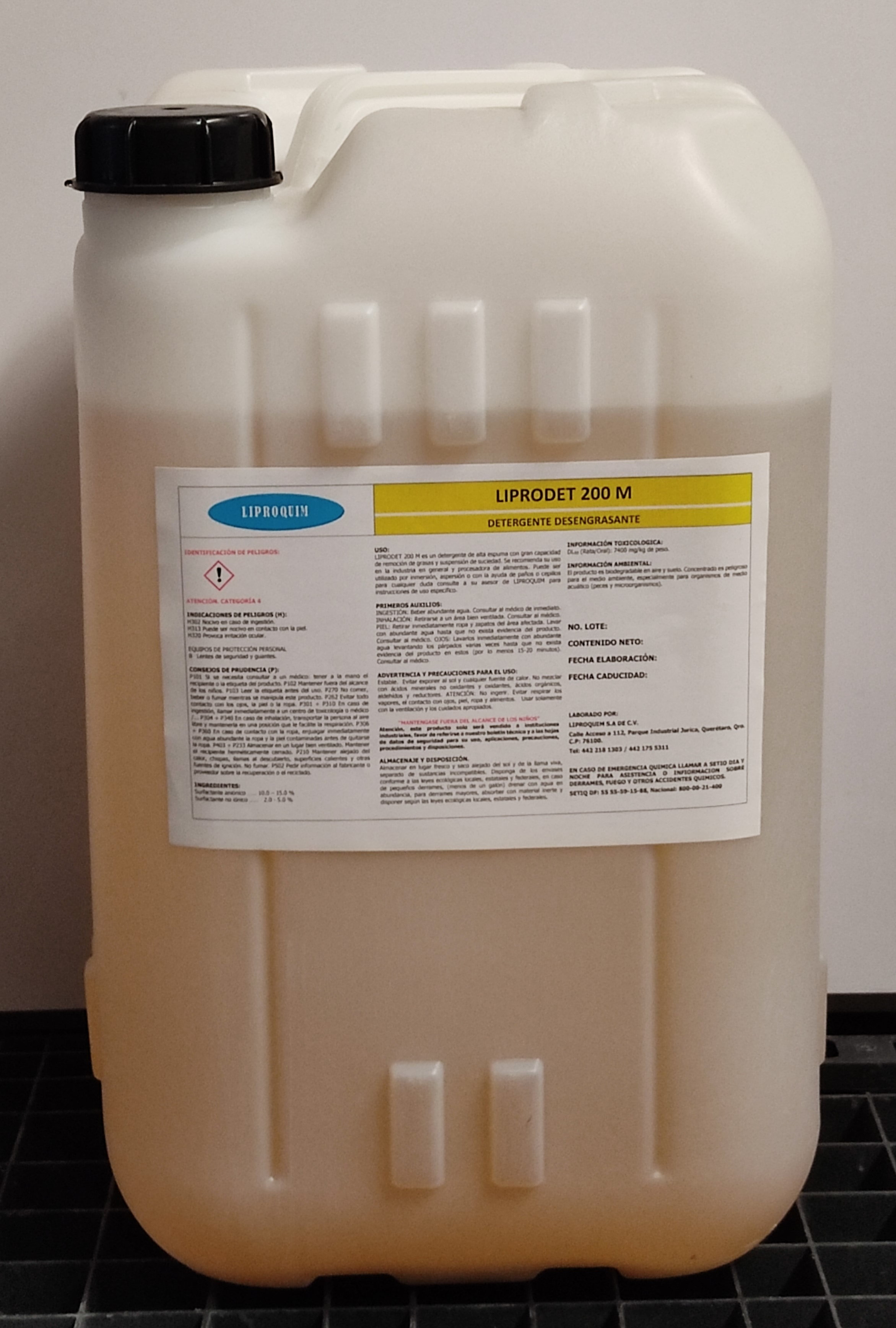 LIPRODET 200 M es una mezcla de surfactantes aniónicos y no iónicos, producto diseñado especialmente para la remoción de mugre tal como puede ser la grasa pegada, aceites industriales, hollín, materia orgánica carbonizada, etc., realizando el proceso de limpieza con gran eficiencia. Posee un gran poder de penetración, desprendiendo fácilmente la mugre más pegada, gracias a su mezcla de tensoactivos, que reducen la tensión interfacial y emulsifican la mugre, evitando su redeposición sobre la superficie a limpiar.